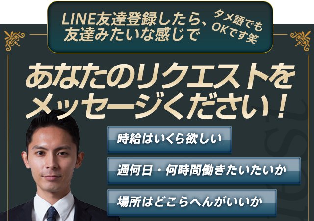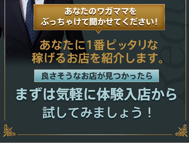 実際にちょっとだけ働いてみて、女性キャストやお客様、お店のスタッフなどの雰囲気を感じてください。 そうして「これなら働けるかな」と思ったら、初めて本入店することをおすすめします。 もちろん、体入とは言っても、時給3,000円以上は出ますので、稼ぐこともできちゃいます♪その辺も、業界歴10年のエージェントに友達感覚でLINEから相談してみてください。