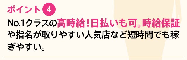 また、一般的に高時給な場合、指名のノルマがあったりしますが、繁盛店なので自動的に指名が回ってきたり、先輩キャストのヘルプに付くだけなので、無理に営業することないので安心です。