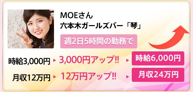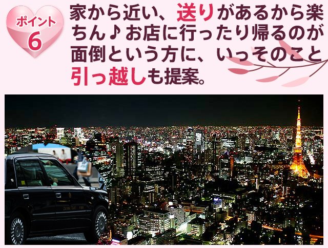 職場が家から近いというのはそれだけでシンプルにメリットがあります。 なので、ナイトハローワークは、業歴20年の経験を活かして、東京のどの店舗でも紹介することができます。そこらへん友達や知り合いの紹介とは違いますね。 一般的に、銀座や六本木、新宿などの繁華街の方が、時給が高い傾向になります。 しかし、その近くに住むとなるとどうしても家賃も高くなってしまいますね。 そこで、車での送りがあれば、多少遠くても通えるって方は、そういう提案も全然あります。 それでも、出勤がダルいという方向けに、店舗の移転はもちろん、いっそのこと引っ越しのお手伝いまでさせて頂きます! そこらへん夜で働く女の子のカユイところまで届くサービスがあるので、何でも話してくださいね♪