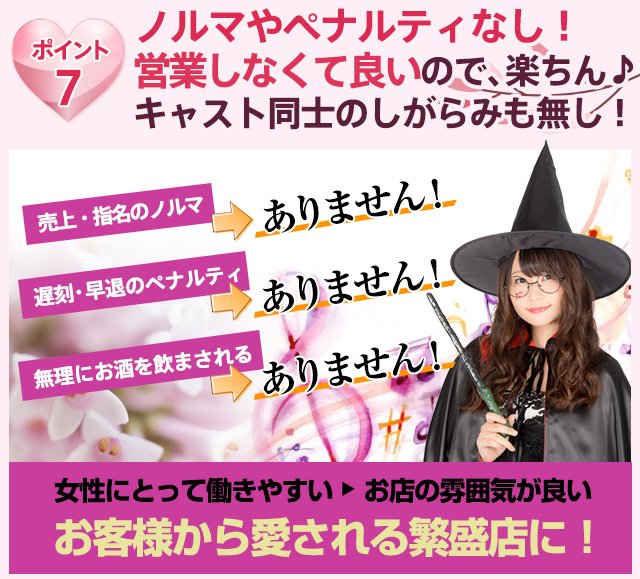 売上・指名のノルマや、遅刻・早退のペナルティのないお店を選べます! 売上や指名のノルマがあると、無理に営業してリピートしてもらうのに大変だったり、キャスト同士でお客様を取り合ってしまうことがあったり、ノルマにはデメリットの方が大きいので、ノルマが一切ないお店も増えてきています。 また、無断欠勤などの重度な過失を除いて、遅刻や早退などにはペナルティは課さない店舗も多いです。 あまりにも素行が悪い場合を除いて、細かいことにとやかく言うよりも、気持ちよく接客をしてもらうための配慮で、そのような軽度なミスには罰金をとらないようです お客様や先輩キャストからお酒を無理に飲ませされるの防ぐためスタッフの教育が行き届いている優良店舗のみ紹介しています。 結局、女性にとって働きやすいお店が、雰囲気も良くなり、お客様から愛される繁盛店へとなっていきます。