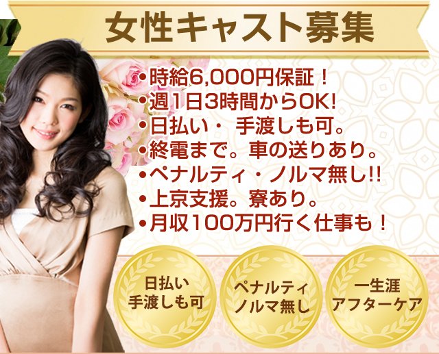 職場が家から近いというのはそれだけでシンプルにメリットがあります。 なので、ナイトハローワークは、業歴20年の経験を活かして、東京のどの店舗でも紹介することができます。そこらへん友達や知り合いの紹介とは違いますね。 一般的に、銀座や六本木、新宿などの繁華街の方が、時給が高い傾向になります。 しかし、その近くに住むとなるとどうしても家賃も高くなってしまいますね。 そこで、車での送りがあれば、多少遠くても通えるって方は、そういう提案も全然あります。 それでも、出勤がダルいという方向けに、店舗の移転はもちろん、いっそのこと引っ越しのお手伝いまでさせて頂きます! そこらへん夜で働く女の子のカユイところまで届くサービスがあるので、何でも話してくださいね♪