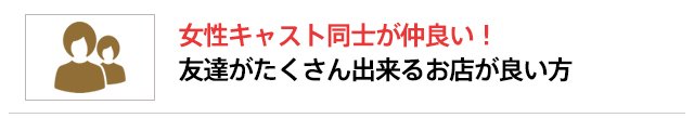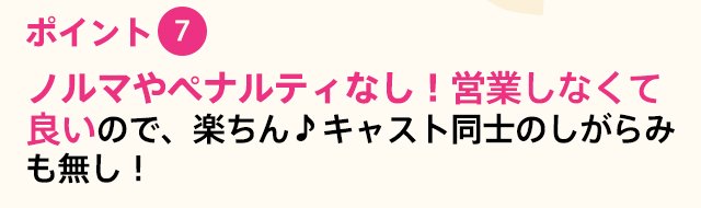 売上・指名のノルマや、遅刻・早退のペナルティのないお店を選べます! 売上や指名のノルマがあると、無理に営業してリピートしてもらうのに大変だったり、キャスト同士でお客様を取り合ってしまうことがあったり、ノルマにはデメリットの方が大きいので、ノルマが一切ないお店も増えてきています。 また、無断欠勤などの重度な過失を除いて、遅刻や早退などにはペナルティは課さない店舗も多いです。 あまりにも素行が悪い場合を除いて、細かいことにとやかく言うよりも、気持ちよく接客をしてもらうための配慮で、そのような軽度なミスには罰金をとらないようです お客様や先輩キャストからお酒を無理に飲ませされるの防ぐためスタッフの教育が行き届いている優良店舗のみ紹介しています。 結局、女性にとって働きやすいお店が、雰囲気も良くなり、お客様から愛される繁盛店へとなっていきます。
